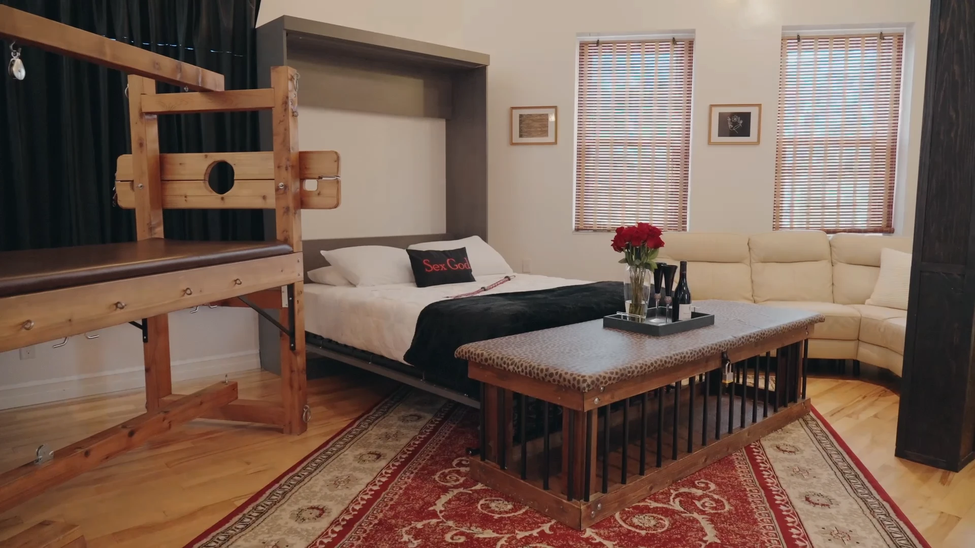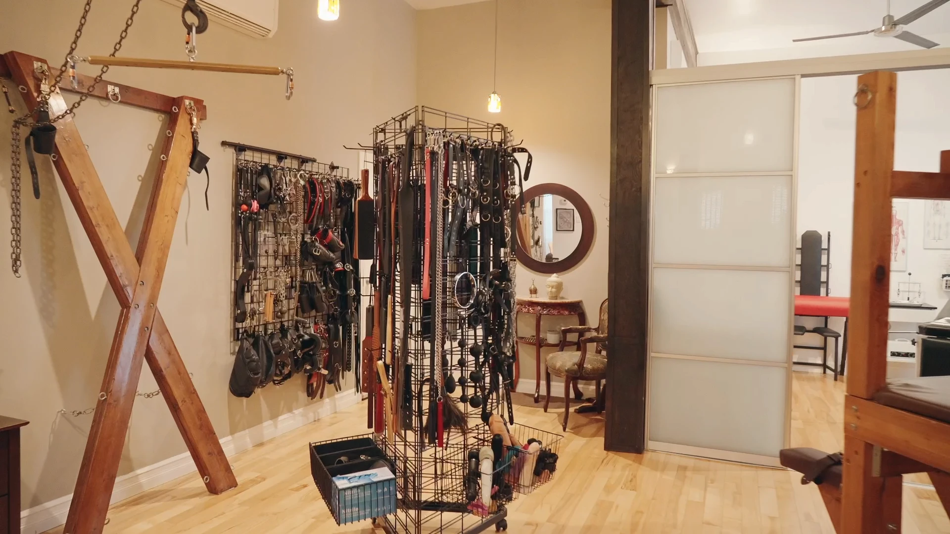 Хорошо оборудованная и полностью меблированная, она предлагает множество приспособлений для БДСМ и широкий выбор высококачественных игрушек и инструментов.