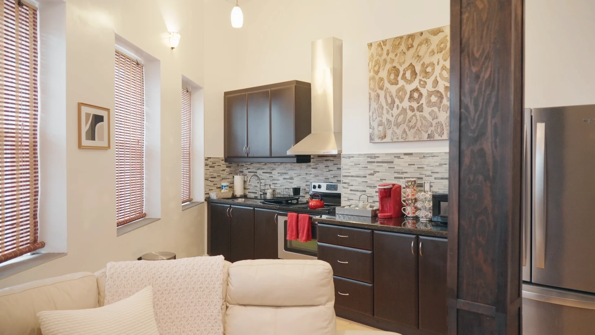 В студии есть основная игровая зона и лаунж-зона в просторной главной части, отдельная медицинская комната за раздвижными стеклянными дверями, которые можно закрыть для уединения, полностью открытая кухня и ванная комната с душевой кабиной.